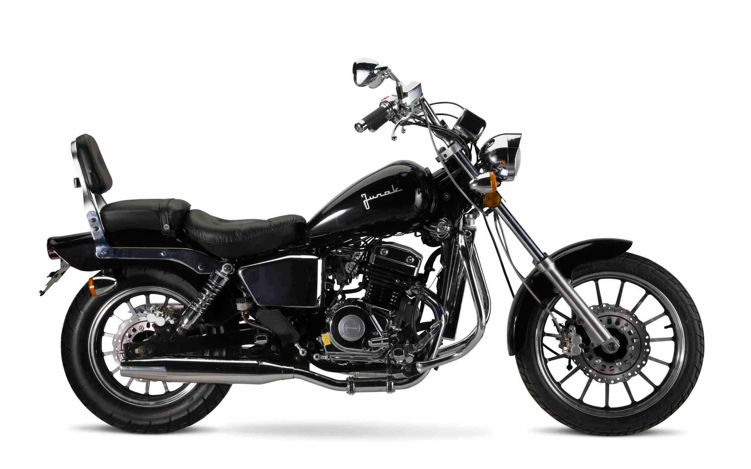 Stylistycznie 11-tka jest hybrydą spajającą idee cruisera i choppera ? idealna propozycja dla zwolenników prostych, nieskomplikowanych rozwiązań. Mówiąc wprost, to elegancki motocykl o zdecydowanej, klasycznej linii. Przednie zawieszenie jest nieznacznie wysunięte do przodu, delikatne lagi teleskopów zamyka nad aluminiową obręczą płytki błotnik. Koło o cienkim profilu, zdecydowanie większe od tylnego, zgodnie z kanonami obowiązującymi w kategorii chopper. Definicję przodu określa niewielka lampa oraz pojedynczy kielich szybkościomierza. Prosto, surowo, zgodnie z kanonami zarezerwowanymi dla tego stylu. Oglądając motocykl z pozycji kierowcy przede wszystkim zwrócimy uwagę na masywną półkę przedniego zawieszenia oraz wygodną, szeroka kierownicę typową dla cruiserów. Poniżej zbiornik w kształcie łezki wyróżniony oryginalnym malowaniem. Oś symetrii stanowią trzy pasy w stalowym kolorze ? dwa wąskie po bokach i jeden szerszy poprowadzony środkiem. Stylistyczny manewr cały efekt zawdzięcza doskonale przemyślanej grze kolorów. Przy projektowaniu tego modelu główny nacisk położono na wygodę podróżowania. Solidna, miękka i świetnie wyprofilowana kanapa, nożne podesty, wygodna i funkcjonalna armatura. Motocykl wyposażono również w gmole ? niezwykle pożyteczny dodatek zwłaszcza w przypadku ślizgu, poza tym estetyczna konstrukcja, świetnie korespondująca z charakterem motocykla. Motocykl wyposażono także w bardzo efektywny zespół hamulców. Przód obsługuje hydrauliczny układ dwóch tarcz, natomiast tył również hydrauliczny układ jednotarczowy. W ogólnej ocenie Junak M-11 to mocny, dynamiczny motocykl wpisujący się w oczekiwania zwolenników klimatów klasycznych. Dużo chromu, zdefiniowana kolorystyka i zwarta bryła. W segmencie tanich motocykli o małych pojemnościach Junak M-11 to bezwzględnie ścisła czołówka. Równie dobrze sprawdzi się jako alternatywny środek codziennego transportu, jak i motocykl pozwalający realizować turystyczne pasje.